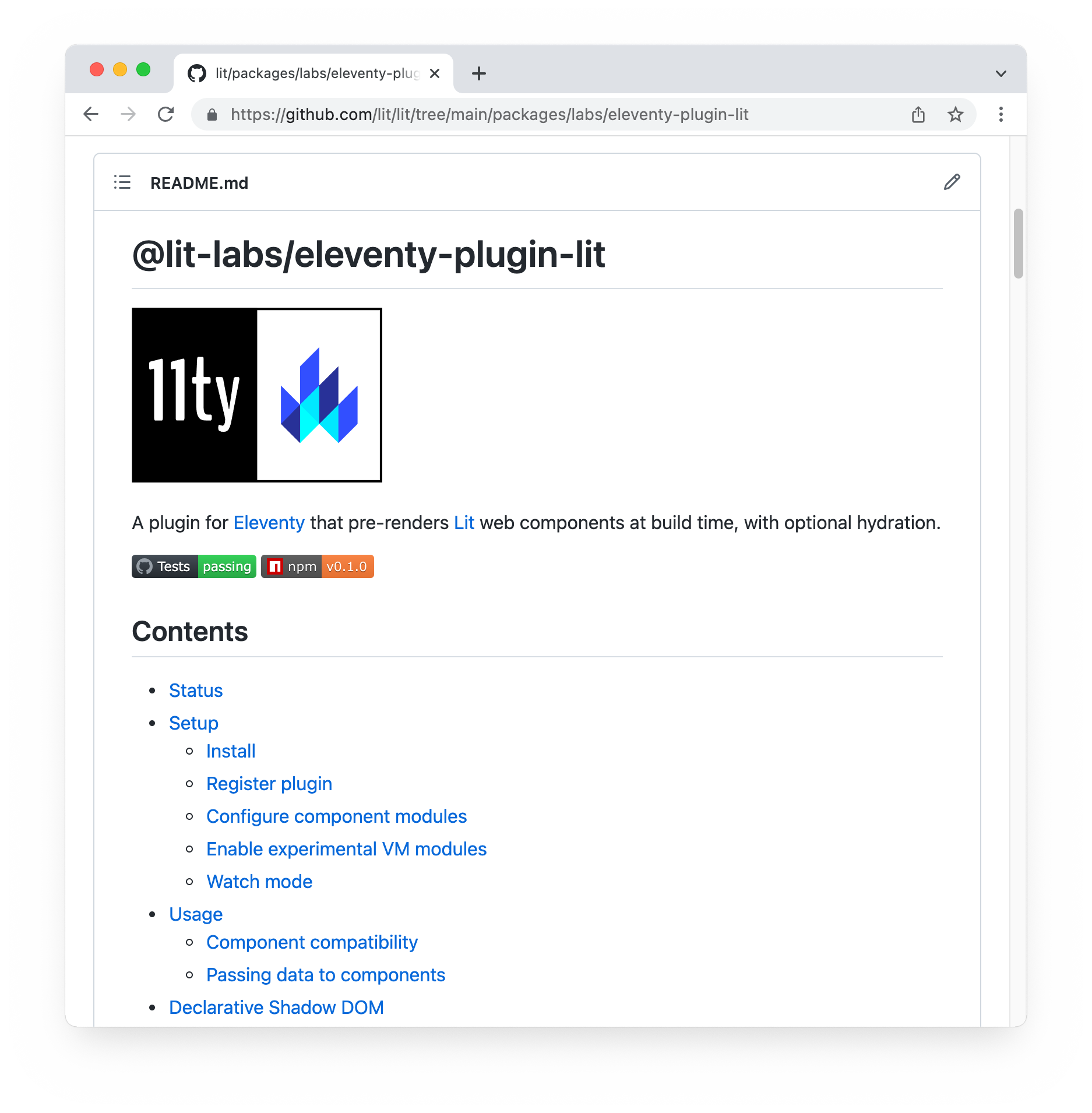 The Lit team is pleased to announce an experimental preview release of @lit-labs/eleventy-plugin-lit, a new plugin for Eleventy that renders your Lit components as static HTML during your Eleventy build, and lets you hydrate them after your JavaScript loads.