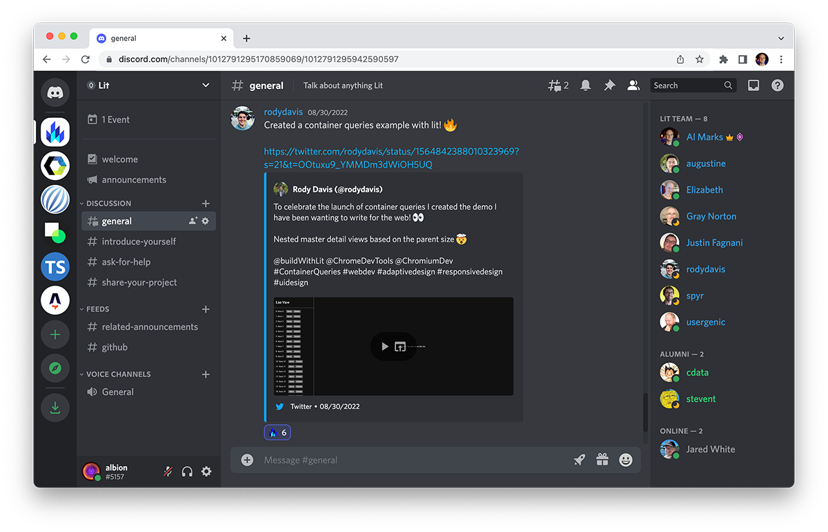 We think the Lit Discord will be the best place to chat with the Lit community, talk to the Lit dev team, get help using Lit, and show off your Lit projects! We also plan to host special events there, using both chat and voice!